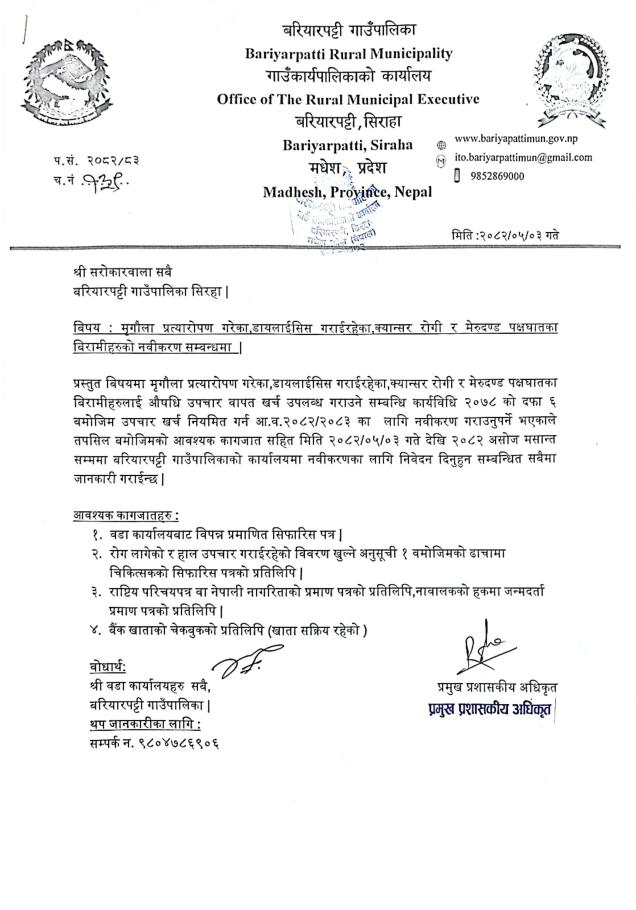» मृगौला प्रत्याराेपण गरेका, डायलाईसिस गराईरहेका, क्यान्सर राेगी र मेरूदण्ड पक्षघातका बिरामीहरूकाे नवीकरण सम्बन्धमा ।