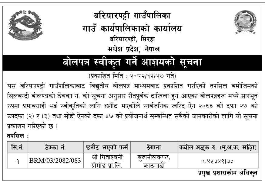 BRM/03/2082/083 काे बाेलपत्र स्वीकृत गर्ने आश्यकाे सूचना ।