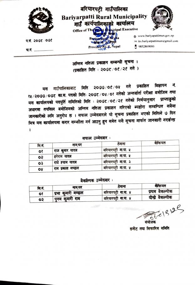अन्तिम नतिजा प्रकाशन सम्बन्धी सूचना ।