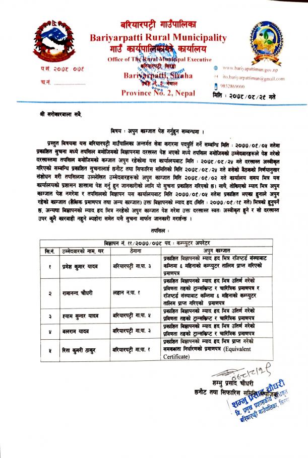 अपुग काग्जात पेश गर्नुहुन सम्बन्धमा