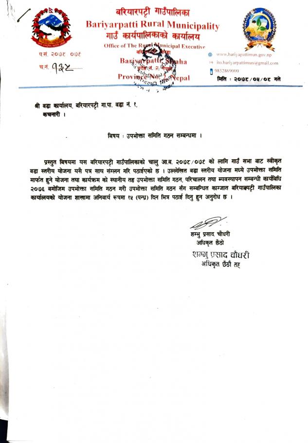 उपभोक्ता समिति गठन गराई पठाई दिने सम्बन्धमा (श्री वडा नं.१ काे वडा कार्यालय)