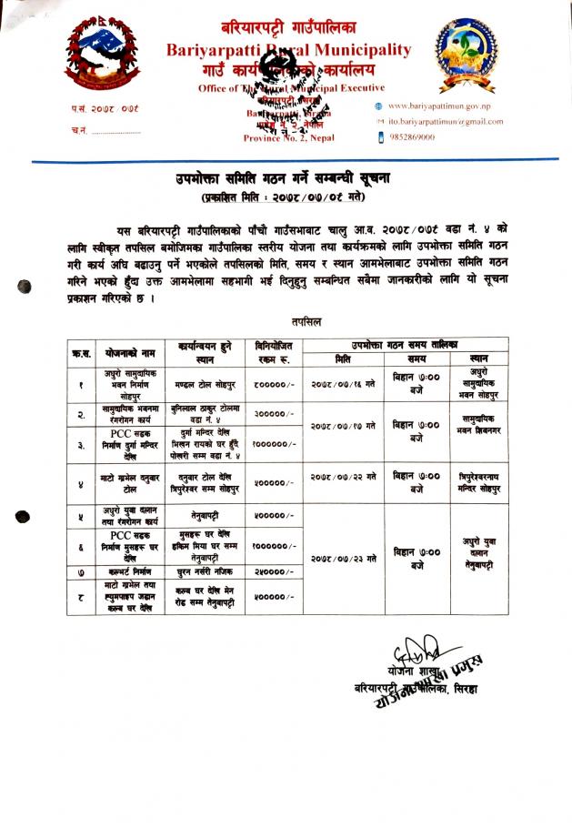 उपभोक्ता समिति गठन सम्बनी सुचना ।(वडा नं. ४ काे लागि)
