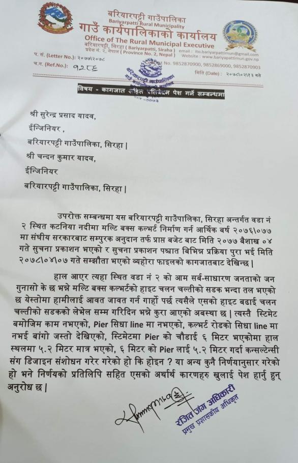 काग्जात सहित प्रतिबेदन पेश गर्ने सम्बन्धमा ।( श्री चन्दन यादव ईन्जिनियर र सुरेन्द्र प्रसाद यादव ईन्जिनियर)