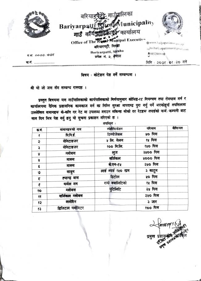 काेभिड-१९ राेकथाम तथा नियन्त्रणकाे लागि आवश्यक सामग्री खरिदकाे लागि काेटेशन पेश गर्ने सम्बन्धमा ।