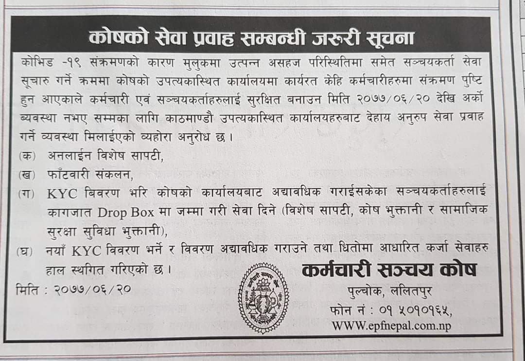 » काेषकाे सेवा प्रवाह सम्बन्धी जरूरी सूचना ।(कर्मचारी संचय काेष पुल्चाेक ललितपुर बाट जारी गरिएकाे सुचना)