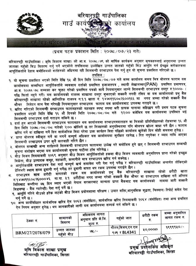 गहु बीउ खरिदकाे लागि सिलबन्दि दरभाउपत्र आह्वान सम्बन्धि सुचना