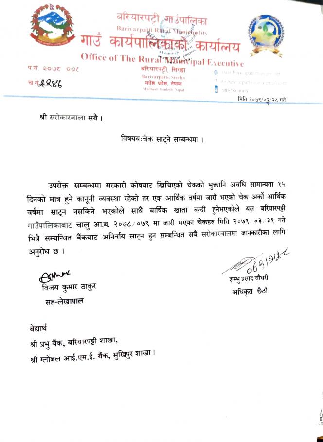 चेक साटने सम्बन्धमा ।