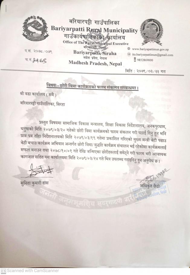 छाेरी विमा कार्यक्रमकाे फारम संकलन सम्बन्धमा ।