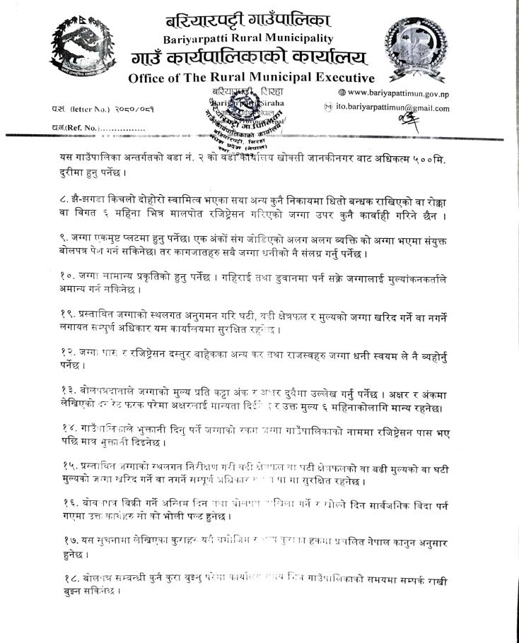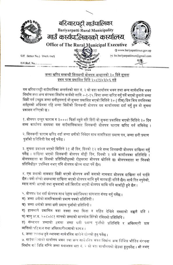 » जग्गा खरिद सम्बन्धी शिलबन्दी बाेलपत्र आव्हानकाे सूचना ।