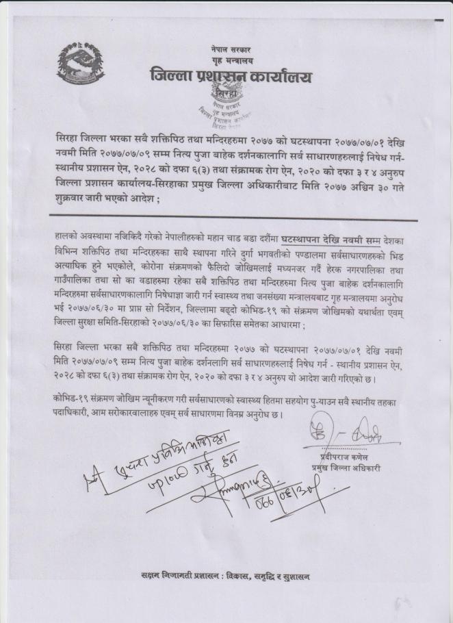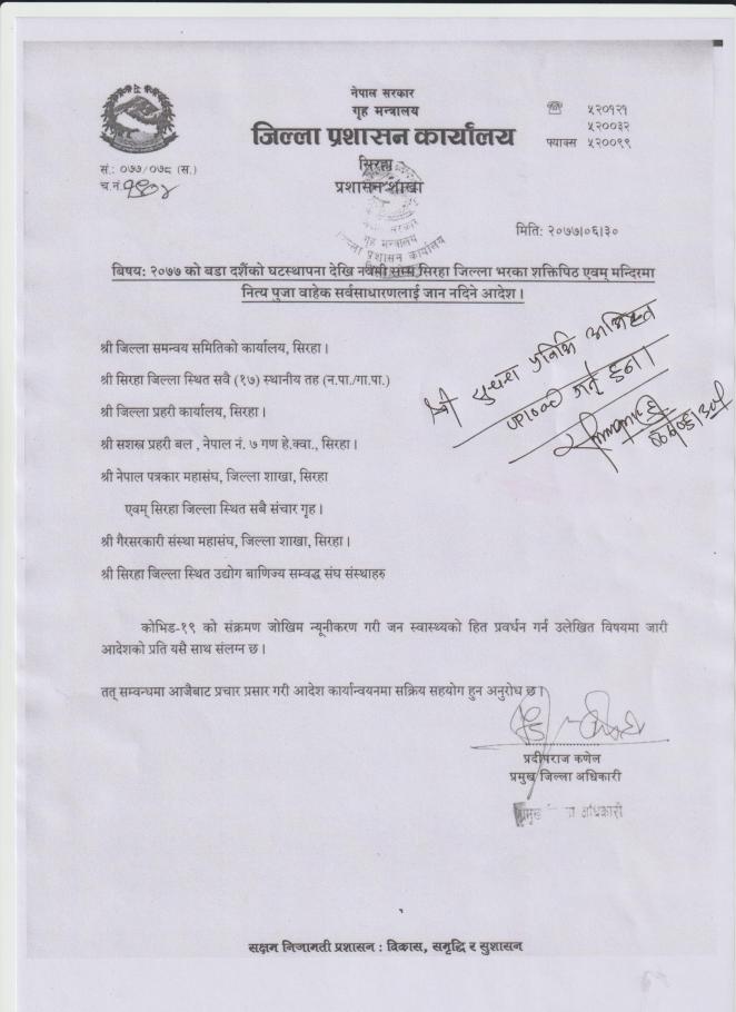 » जिल्ला प्रशासन कार्यालय सिरहाको आदेश