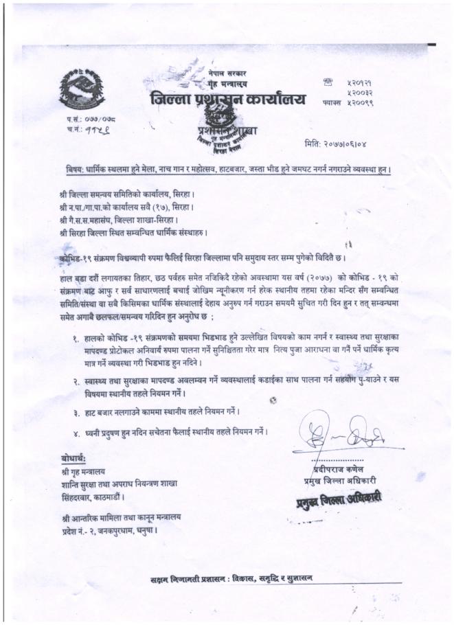धार्मिक स्थलमा हुने मेला नाच गान र महाेत्सव हाट बजार जस्ता भीड हुने जमघट नगर्न नगाराउने सम्बन्धी सुचना ।
