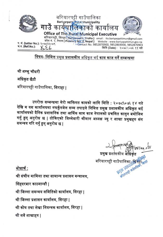» निमित प्रमुख प्रशासकीय अधिकृत भई काम गर्न ताेकिएकाे सम्बन्धमा ।