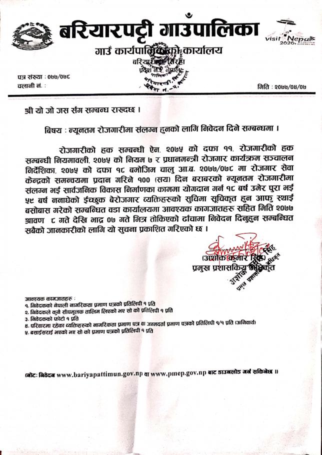 न्युन्तम राेजगारीमा संलग्न हुन निवेदन दिने सम्बन्धमा