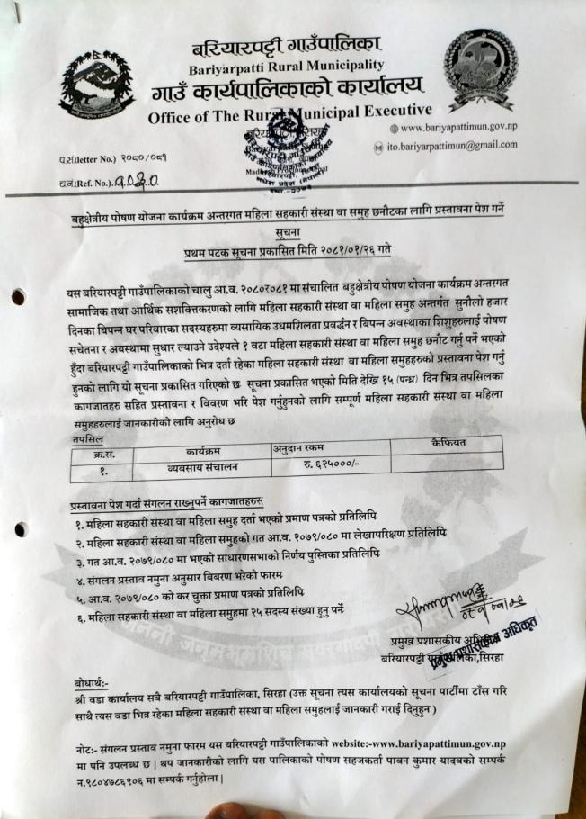 » बहुक्षेत्रीय पाेषण याेजना कार्यक्रम अन्तर्गत महिला सहकारी संस्था वा समूह छनाैटका लागि प्रस्तावना पेश गर्ने सूचना ।