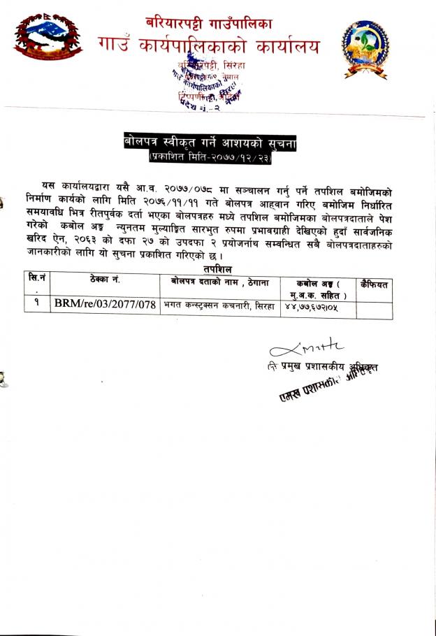 बाेलपत्र स्वीकृत गर्ने आश्यकाे सूचना ।