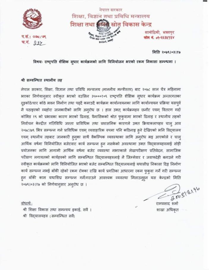 राष्ट्रपति शैक्षिक सुधार कार्यक्रमकाे लागि विनियोजन भएकाे रकम निकासा सम्बन्धमा ।