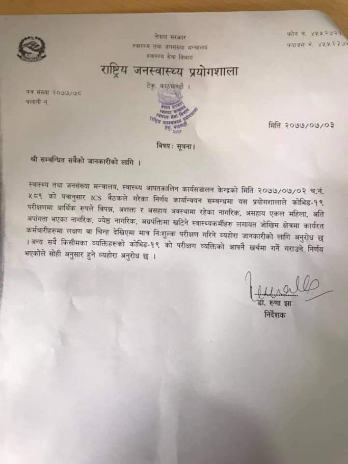 राष्ट्रिय जनस्वास्थ्य प्रयाेगशाला टेकु, काठमाण्डाैले जारी गरेकाे सुचना