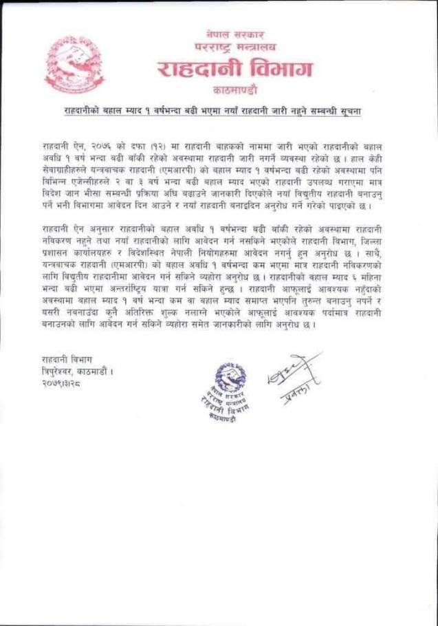 राहदानीकाे बहाल म्याद १ बर्ष भन्दा बढी भएमा राहदानी जारी नहुने सम्बन्धी सूचना ।