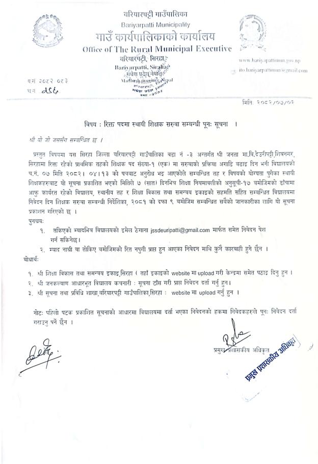 रिक्त पदमा स्थायी शिक्षक सरूवा सम्बन्धी सूचना ।