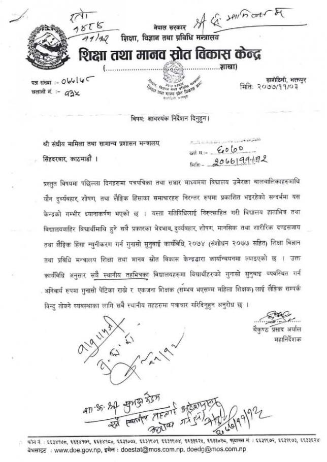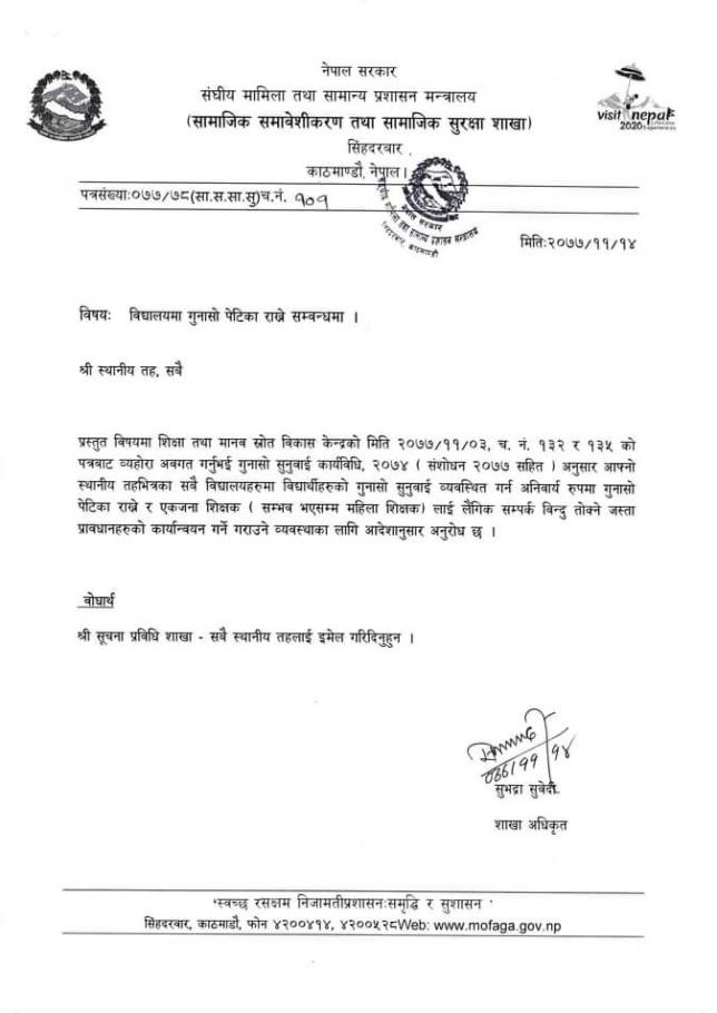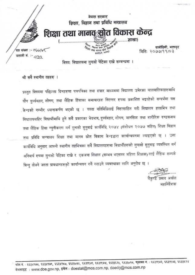 विद्यालयमा गुनासाे पेटिका राख्ने सम्बन्धमा ।