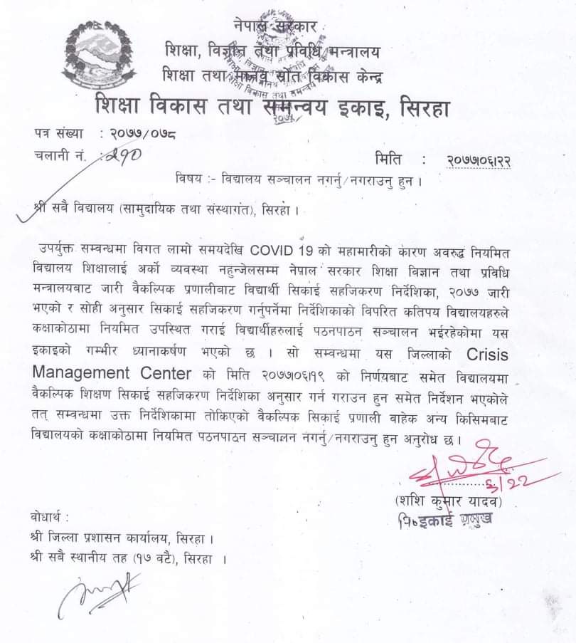 विद्यालय सञ्चालन नगर्नु/नगराउनु हुन ।(शि.वि. तथा स.इकाई,सिरहाकाे पत्र)