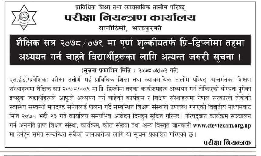 शैक्षिक सत्र २०७८/०७९ मा पूर्ण शुल्कीय प्रि-डिप्लोमा तहमा अध्यन गर्न चाहने विद्यार्थीहरूका लागि अत्यन्त जरूरी सूचना ।