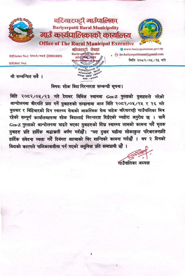 शोक विदा निरन्तर गरिएकाे सम्बन्धि सूचना ।