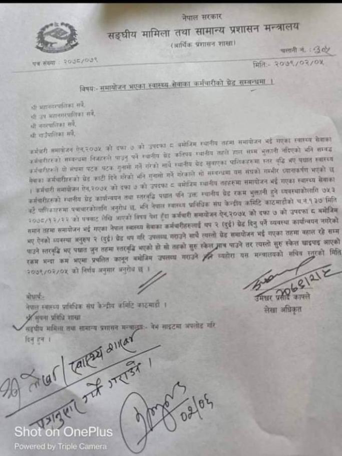 समायोजन भएका स्वास्थ्य सेवाका कर्मचारीकाे ग्रेड सम्बन्धमा ।