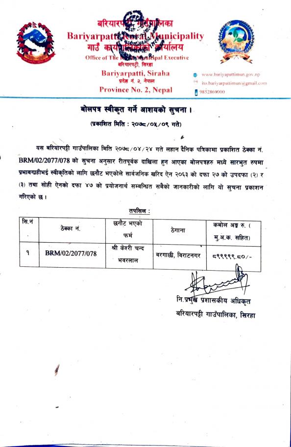 बाेलपत्र स्वीकृत गर्ने आश्यकाे सूचना ।
