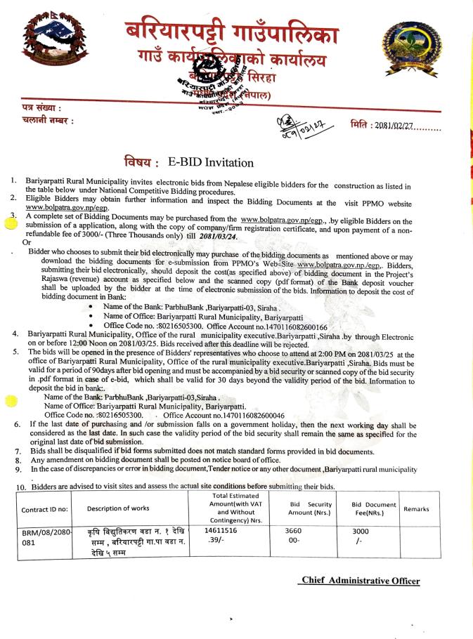 बाेलपत्र स्वीकृत गर्ने आश्यकाे सूचना ।