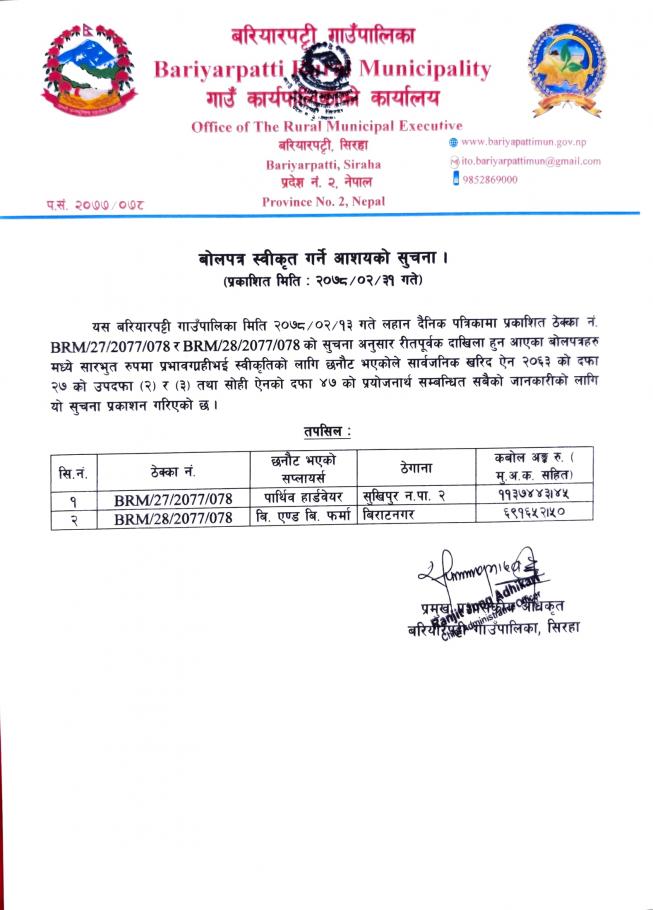 » BRM/27/2077/078 र BRM/28/2077/078 काे बाेलपत्र स्वीकृत गर्ने आशयकाे सुचना