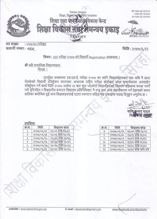 SEE परिक्षा २०७७ काे विद्यार्थी Registration सम्बन्धमा । (श्री सबै माध्यमिक विद्यालयहरु, सिरहा)